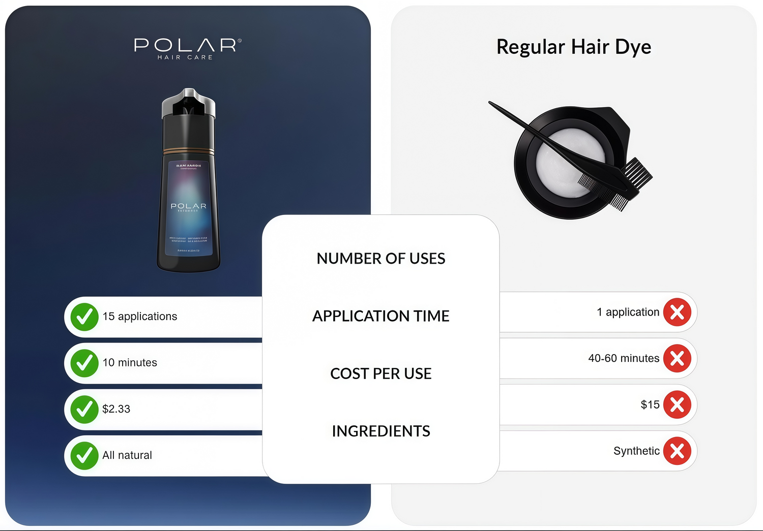 Thats why we created PolarHair—a 3-in-1 dye shampoo that covers grays in just 10 minutes, with no mess, no harsh chemicals, and zero compromises.